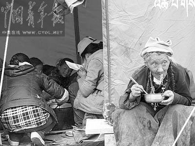 4月17日,玉树县牦牛广场,一位藏族老妈妈正在帐篷外吃午饭。