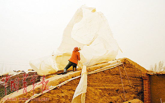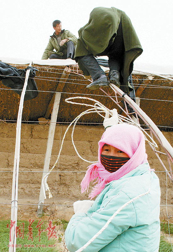 大坝乡城近村,村民们正在冒着大风抢修日光温室。由于紧挨西沙窝,沙尘暴袭来,这里设施农业受灾更为严重。