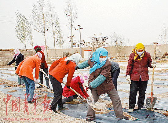 沙尘暴过后,大田农膜多被大风揭起,苏武乡蒲杨村村民正在抓紧时间把残损的农膜用土覆盖起来。