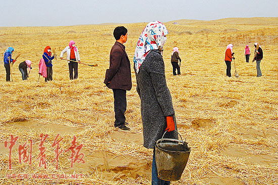 春天,村民在老虎口压沙。老虎口是民勤西边最大的风沙口,近年来,民勤县以巨大的人力和财力对老虎口进行了大规模治理,生态效益十分显著。