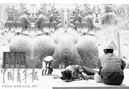 4月30日,刚刚完成施工的工人等待离开世博园,面前的冰岛馆外墙布满放大的冰晶体图案。本报记者 郑萍萍摄
