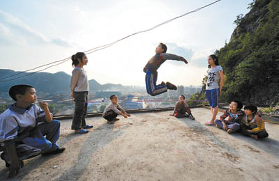5月2日,贵阳市富源路建在岩崖上的简陋民居房,孩子们在屋顶上玩耍。