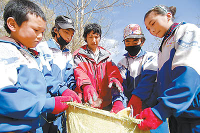 5月4日,青海省玉树藏族自治州结古镇,来自玉树当地的志愿者白玛仁增(中)带领玉树县第二民族中学的学生一起捡拾生活垃圾。白玛仁增是玉树江源发展促进会的一名志愿者,致力于环保的他和同伴们在结古镇受灾群众临时安置点宣传生活垃圾分类处理。