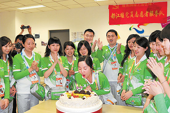 照片:5月12日,上海世博会志愿者部园区志愿者组组长、世博局园区志愿者部部长夏科家和陈乔乔一起庆祝生日。世博会注册大学生记者 胡康榆摄