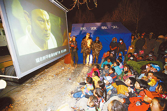 4月24日,第二炮兵抗震救灾部队文化服务队,来到玉树结古镇团结村,为该村送来震后的第一场电影。