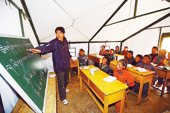 当上课的哨声响起时,四(2)班的学生早已端着书本坐在了帐篷教室里。班里有25名学生,藏族学生占了23名。班主任永珠措吉大声地问着她的学生:“自然界的生命是坚强的,我们就从《生命生命》这节课开始学起,好不好?”学生们给予的是更加大声的回应:“好!”