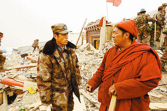 一脸焦急,一身疲倦,官兵们给小阿卡拿来一瓶矿泉水解渴。“藏传佛教文化是中华民族文化的瑰宝,要千方百计想法进行挽救。”这是写在二炮抗震救灾指挥所大事记上的话语,也是官兵们的共同意愿。“我们不仅仅是在抢救文物,我们是在代表党和国家表达对藏传佛教历史文化的尊重!”第二炮兵抗震救灾指挥部指挥员高海华郑重地告诫部队。半小时后,某导弹旅副旅长毛鹏德带领400名官兵立即增援禅古寺。