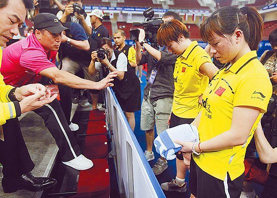 5月15日,吉隆坡,中国女队不敌韩国队痛失尤伯杯。中国队第一女双马晋/王晓理输球后,在接受主教练李永波的指导。CFP供图