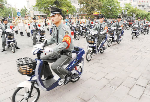 5月17日,发放电瓶车仪式后,28名保安队长骑车前往校园周边巡逻。当日,北京市东城警方建立了一支由28名保安队长组成的电瓶车巡逻队伍,以保障辖区校园周边安全。