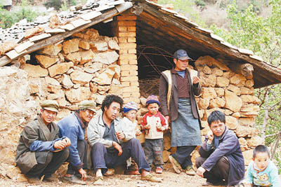 2010年4月24日,昆明,朵马嘎村的男人们在村口等爱心水。