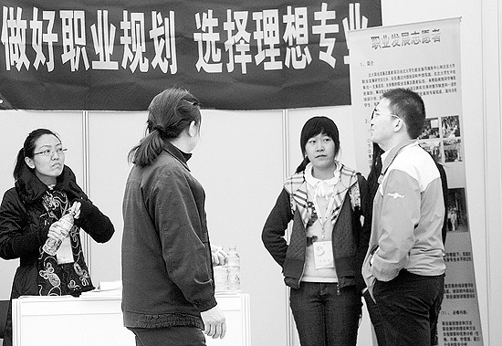 2010年4月17日,北京大学2010年校园开放日暨本科招生咨询会在百年讲堂举行。北大展台悬挂着“做好职业规划选择理想专业”条幅。吴长青摄