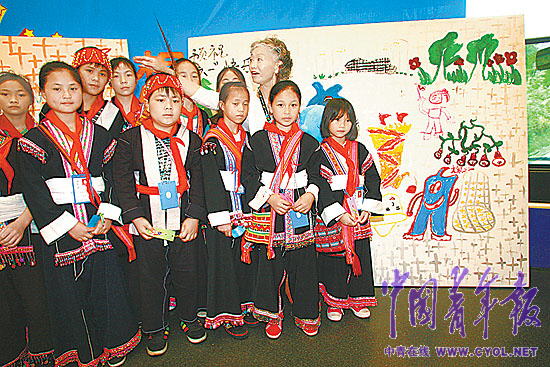 5月28日,上海世博会中国民企联合馆,来自广东省连南瑶族自治县的小朋友和“世博奶奶”山田外美代一起在他们为世博会创作的绘画前合影留念。六一儿童节到来前夕,这12名来自瑶山深处的孩子,在广东一家企业的资助下,进行奇妙的世博之旅。 本报记者 陈剑摄