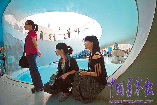 四条美人鱼——5月29日,三位女孩儿以上海世博园丹麦馆的美人鱼为背景留影。本报记者 贺延光摄