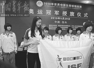 本报讯(记者慈鑫)“2010年世界中学生排球锦标赛”奥运冠军授旗仪式,近日在人民大会堂举行。奥运冠军代表、我国著名排球运动员冯坤和赵蕊蕊向将代表中国队参加本次比赛的包头一中女子排球队,授予了世界中学生排球锦标赛会旗。