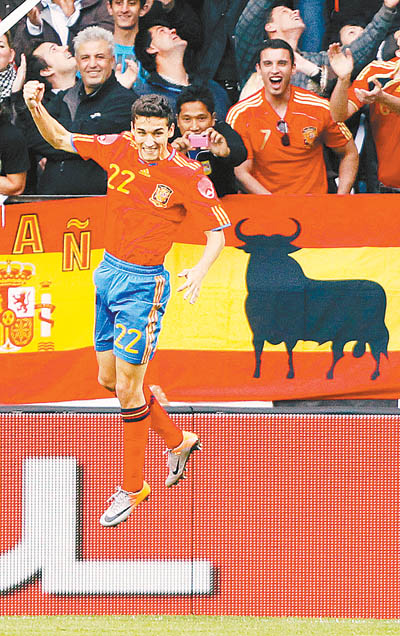 6月3日,西班牙队在世界杯热身赛上小胜韩国队,西班牙球员在庆祝进球。
