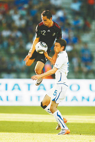 6月3日,意大利球员(下)与墨西哥球员在热身赛中争抢。