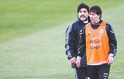 6月3日,阿根廷队的赛前训练中,主帅马拉多纳(后)与头号球星梅西在一起。