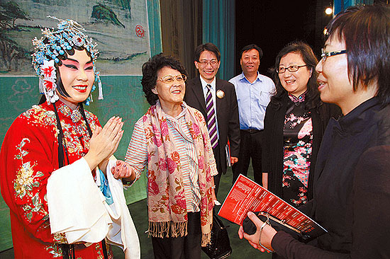 6月4日晚,香港首届中国戏曲节开锣。北京京剧院“程韵绵长——程派艺术展演”作为开幕演出献上《锁麟囊》等程派代表作。图为观众向著名程派传人迟小秋表示祝贺。本届戏曲节主办方香港特别行政区康乐与文化事务署邀请了内地和香港12个剧团,在为期48天的戏曲节期间展演包括京剧、昆曲、粤剧、潮剧等8个剧种的10台节目。 本报记者 李建泉摄