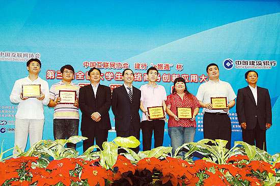 5月31日颁奖典礼现场,中国建设银行电子银行部副总经理马春峰(左四)为企业教官颁奖。实习生 王叔坤摄