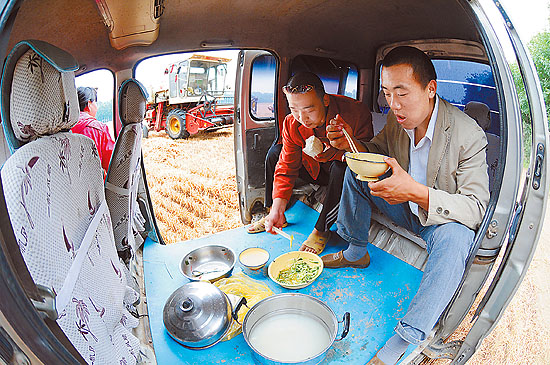 河南省原阳县一个由4台收割机组成的“麦客”小分队连续多年都到新郑市的农村进行定点麦收,他们平均每天每台收割机收割小麦30亩,每亩收服务费40元。为了确保小麦颗粒归仓,机手都是轮番上阵,经常风餐露宿。当日下午4时,记者在新郑市龙王乡新庄村采访时正赶上他们在吃饭,领头的“麦客”刘金祥说:“这是我们今天的第一顿饭,是午饭,也是早饭,晚饭还不知道什么时候吃。”