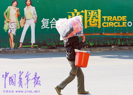 东莞市后街镇,一位工人扛着行李从一处房地产项目的广告牌前经过。