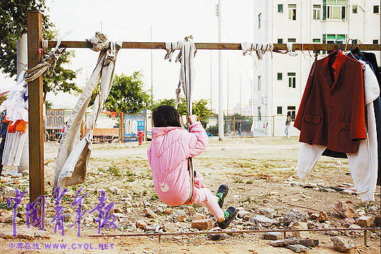 深圳市一处外来务工人员的聚居区,孩子在简陋的秋千上独自玩耍。