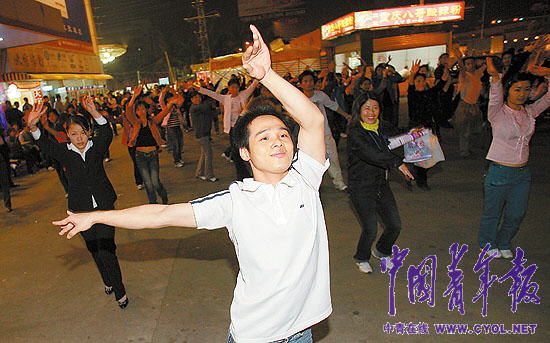 广东省东莞市长安镇某工业区,下班后,工人们自发在广场上学跳集体舞。