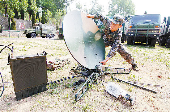6月2日,济南军区组织国家级应急机动通信保障队的官兵进行应急机动通信保障实战演练,锤炼官兵遭遇险情的应急处置能力,确保官兵能够在恶劣环境下快速开设、快速联通。图为应急通信保障分队的战士正在快速组装天线。 梁志杰摄影报道
