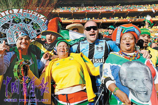 当地时间今天上午10时,距离本届世界杯揭幕战还有5个小时,约翰内斯堡足球城体育场外已经聚集了近千名南非和墨西哥球迷,他们相互并不敌视,反而非常友好地手拉手一起欢呼。一个南非黑人球迷一只手端着一个小纸箱子,箱子里放着几瓶油彩,另一只手拿着画笔,只要路过的人愿意停下来在脸上画一面国旗,他就会高兴地一边唱歌一边在人脸上作画。有意思的是,记者看到,他正在给一位身穿墨西哥队服的白人画脸。