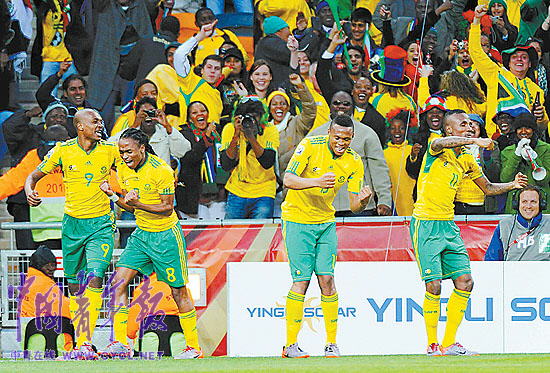 6月11日,2010南非世界杯揭幕战在约翰内斯堡举行。图为南非队在庆祝本队球员沙巴拉拉打进本届世界杯赛上的首粒入球。 本报特派记者 刘占坤摄