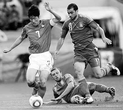 6月12日,韩国队以2∶0击败希腊队。图为韩国队中场核心朴智星(左)在比赛中突破。CFP供图