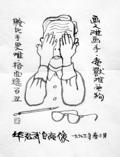 华君武一生画过好几张自画像,可没有一张以“真脸”示人,不是捂着脸,就是背对着。一张用手捂着脸的自画像边,题着一首小诗:画人难画手,画兽难画狗,脸比手更难,捂面遮百丑。他甚至这样“讽刺”自己:画不像自己,何必画,我这一捂,把我的缺点都捂住了。