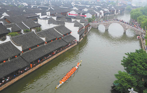 6月15日,龙舟驶过嘉兴市月河街区,与古色古香的老街构成了别样的江南美景。