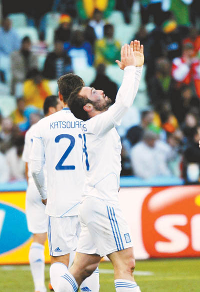 6月17日,希腊队以2∶1战胜尼日利亚队后,希腊队球员“感谢苍天”。