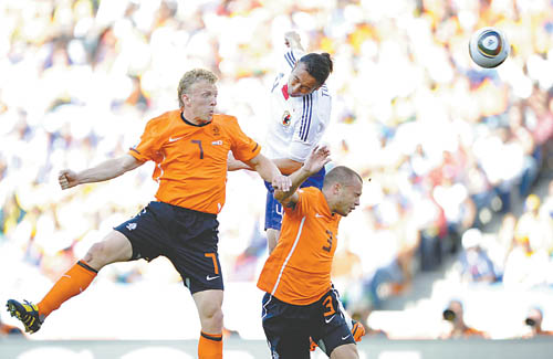荷兰队球员库伊特(左一)、海廷加(右一)和日本队球员争抢头球。6月19日,荷兰队在南非世界杯E组的第二轮比赛中艰难地以1∶0小胜表现顽强的日本队。同日,D组加纳队对澳大利亚队的比赛以1∶1战平。