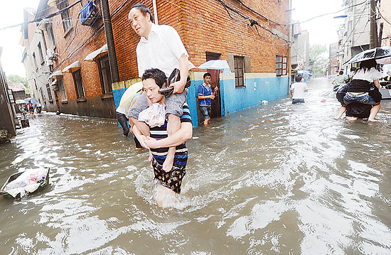 6月19日,在南昌市青云谱区狮子口村,村民扛着家人涉水前行。