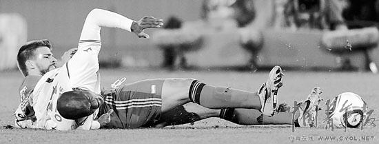 6月22日,西班牙队在世界杯小组赛中以2∶0战胜洪都拉斯队。图为西班牙球员皮克(左)与对方球员争抢。 本报特派记者 刘占坤摄