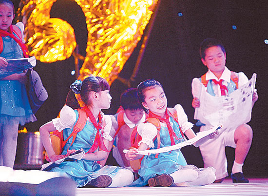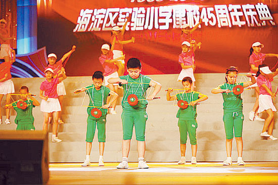 海淀实验小学校长赵树辉及书记赵璐玫和学生们一起同台演出