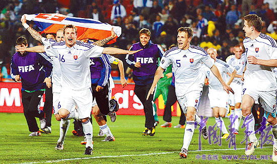 北京时间6月24日,世界杯F组,斯洛伐克对意大利的比赛在南非约翰内斯堡埃利斯公园体育场举行。斯洛伐克队以3∶2战胜上届世界杯冠军意大利队,晋级16强。意大利队则在小组内排名垫底无缘十六强。图为斯洛伐克队庆祝胜利。 本报特派记者 刘占坤摄