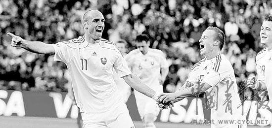 6月24日,斯洛伐克队以3∶2击败意大利队,成功晋级。图为斯洛伐克队员庆祝入球。 本报特派记者 刘占坤摄