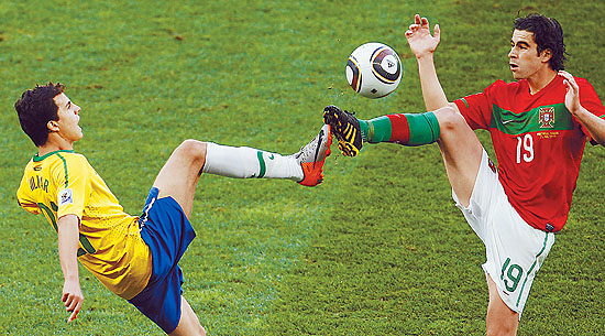6月25日,巴西队在南非世界杯小组赛中,以0∶0战平葡萄牙队。图为双方球员在比赛中“对脚”。CFP供图