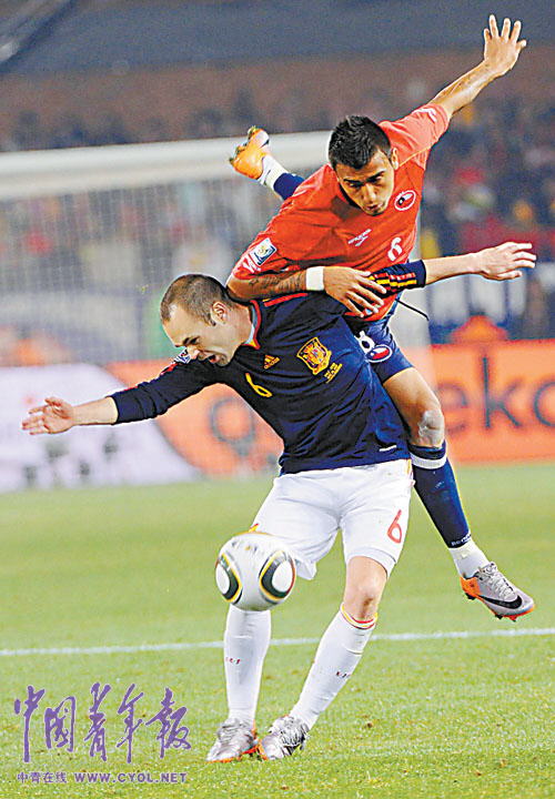 6月26日,南非比勒陀利亚,西班牙队以2∶1战胜智利队,两队携手出线。图为双方球员在比赛中激烈争夺。本报特派记者 刘占坤摄