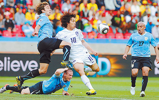 本届南非世界杯第一场淘汰赛,比赛前人们想象的还要激烈。顽强的韩国队最终以1∶2败在乌拉圭队脚下,8强梦碎。