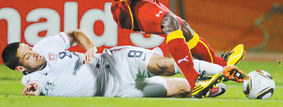 6月27日,美国队在南非世界杯八分之一决赛中,以1∶2不敌加纳队,无缘八强。图为美国队球员邓普西在比赛中铲球。
