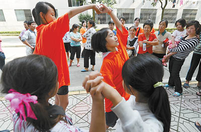 2010年6月26日,在江西抚州一安置点,小志愿者们正在教灾区小朋友跳舞。