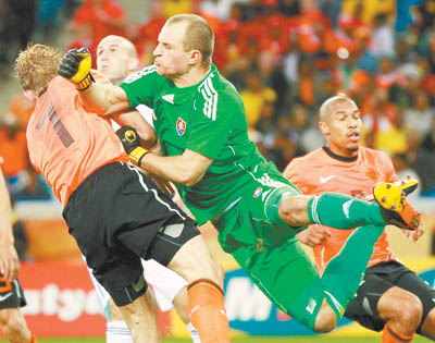 说荷兰队聪明,主要体现在他们为本场比赛做了很充分的准备。从比赛的过程看,他们显然十分了解斯洛伐克队的技术特点——主要靠打反击,技术不够细腻,阵地战办法不多。所以,荷兰队在本场比赛中退守很快,没有给对手太多反击的机会。