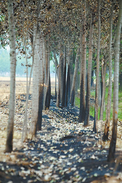 焚烧麦茬时,被烧着的杨树有的已枯死。