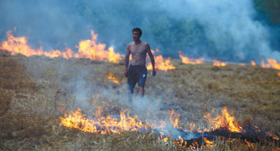 一年前的这个时候,河南省永城市侯岭乡十八里村的赵学龄烧自己麦地的麦茬时,没有注意风向,邻居家几十亩地的小麦还没有收割,眼看着火就要烧到别人的麦田里,自己可赔不起,怎么办?只好把衬衣脱下拍打,火反而着的更加猛烈,急得他对着村里喊救火、救命。村里人也都在自家麦田里忙着收割,一时半会儿也来不了,情急之下,赵学龄在自家麦茬地里打滚,火是扑灭了,他身上的皮肤烧伤了三分之二,花了几千元钱,在家里躺了三个月。现在邻里们一烧麦茬,就开玩笑说:“烧麦茬,还是找十八里村的赵学龄在行,能把自己给烧着。”