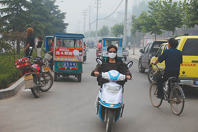 6月25日,由于连续几天焚烧麦茬,河南省永城市街头烟雾弥漫,一位女士戴着口罩和墨镜出行。
