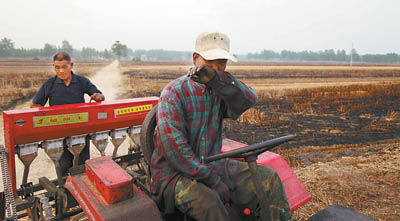 麦茬焚烧后,河南省永城市侯岭乡韩庄村村民开始播种玉米。